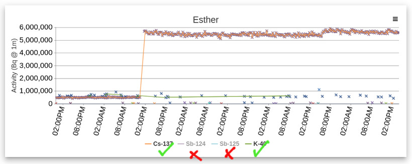 You can choose which isotopes you want to include when exporting to a spreadsheet. By clicking on the chart legend you can hide data for isotopes that you want to leave out of your spreadsheet. In the image below you can see that only Cs-137 and K-40 will be included when clicking Download1. The isotopes Sb-124 and Sb-125 will not be included.